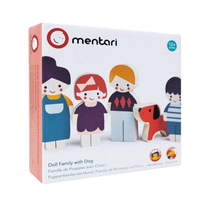 O familie de păpuși cu câine de Mentari sunt gata să se mute în noua ta casă de păpuși.