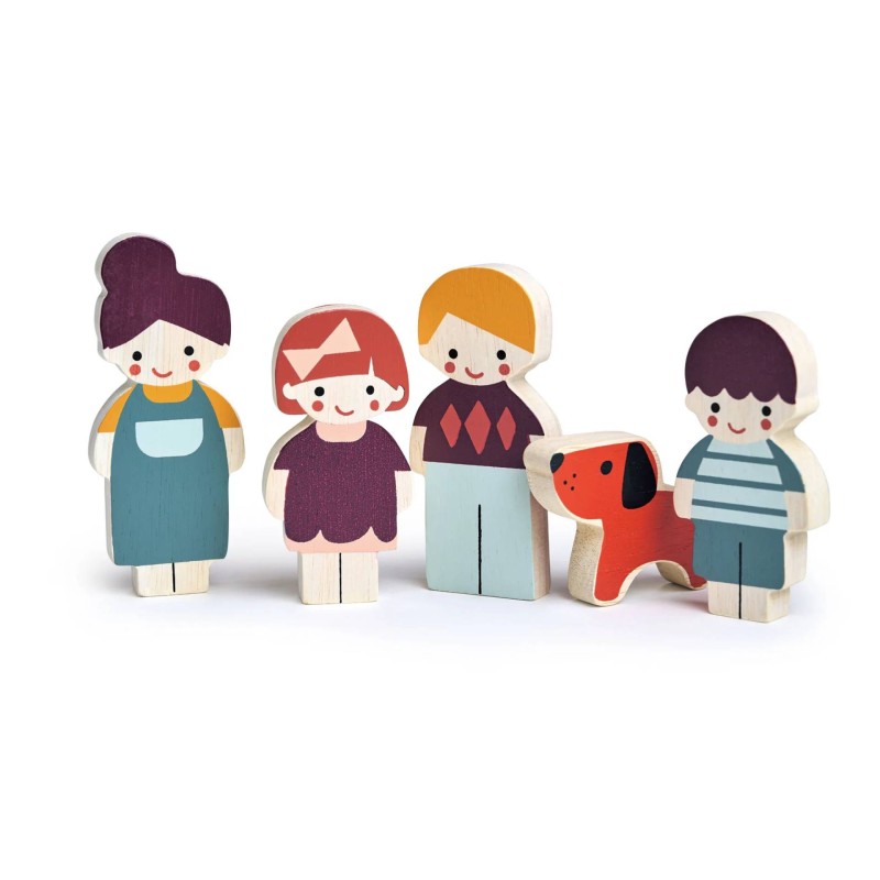 Această adorabilă familie de păpuși din lemn masiv include doi părinți, doi copii și cățelul lor jucăuș, gata să aducă viață și râsete în orice casă de păpuși.