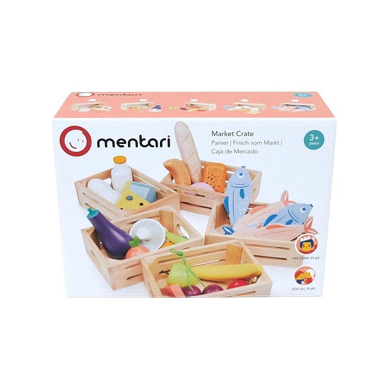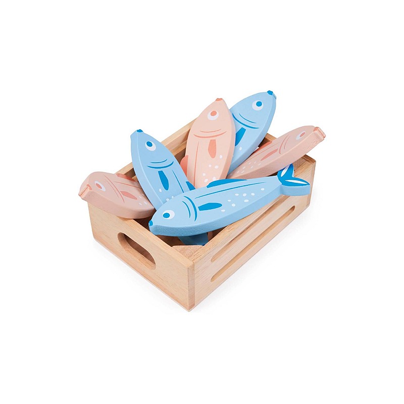 Scufundă-te în jocul imaginativ cu coșul nostru Fish Market Basket, un set de mâncare de joacă din lemn cu trei pești albaștri și trei pești roz.