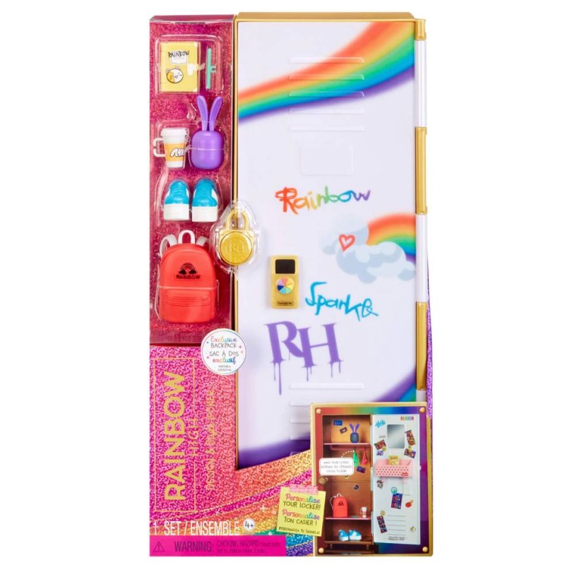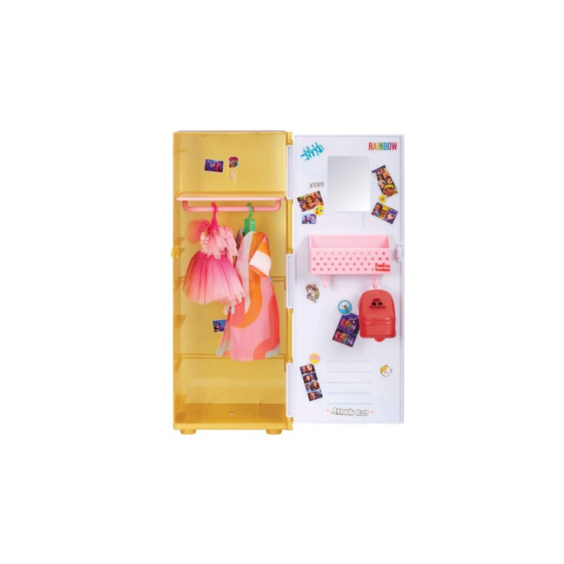Dulapul școlar Rainbow High Fashion Doll se deschide și se închide și vine cu un lacăt cu marca Rainbow High. Inauntru incape chiar și o păpușă Rainbow High înăuntru