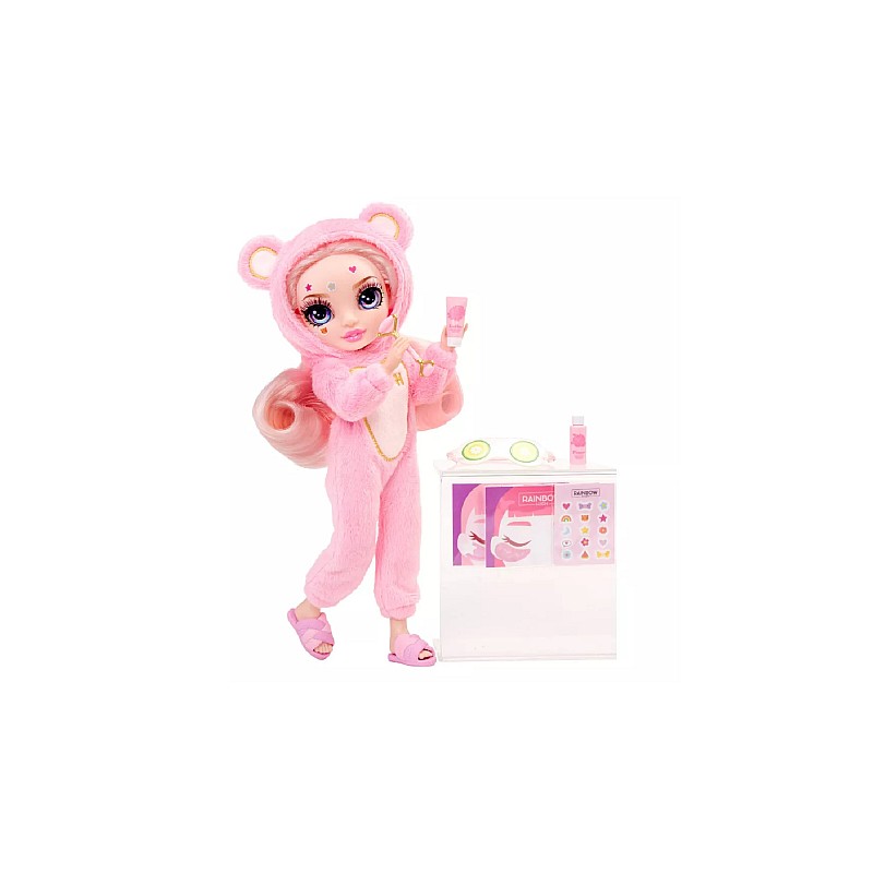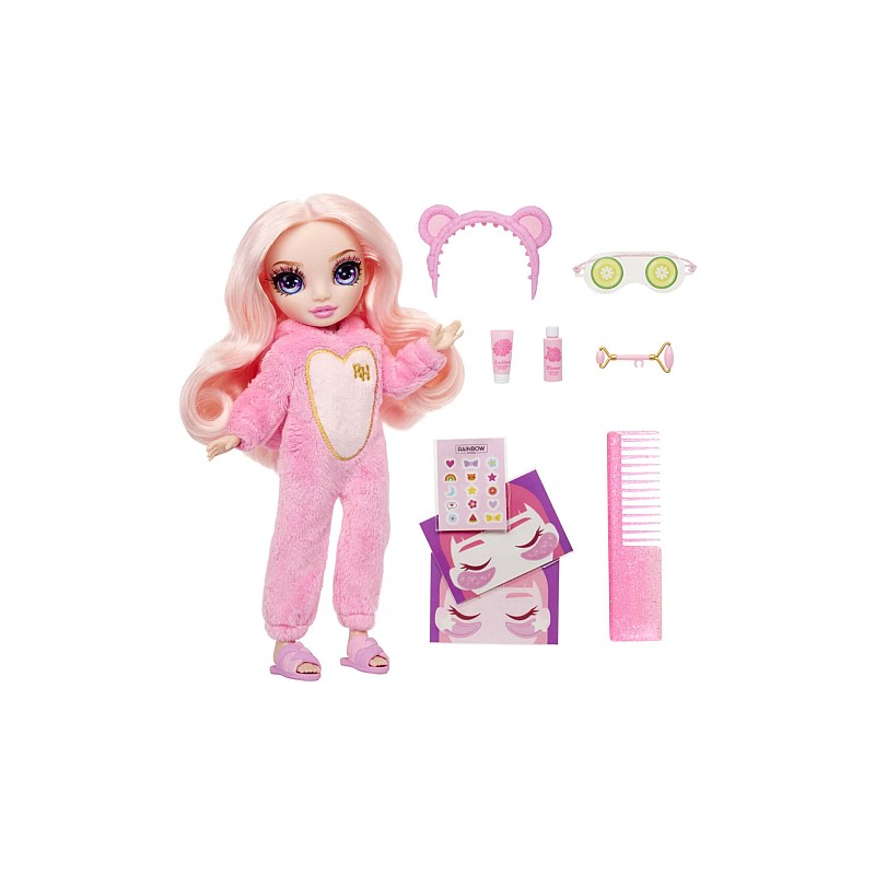 Păpușă de modă, o ținută completă de pijama, o pereche de papuci de păpușă, mască de ochi de castravete, autocolante pentru coșuri, role de față, măști sub ochi, bandă de păr și pieptene de păpușă.