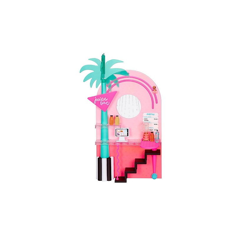 Acest set de joacă 5-n-1 include: un spa cu o cascadă funcțională, un salon de coafură cu o oglindă luminoasă, o stație de spălat părul funcțională, un salon de unghii și un bar de sucuri.