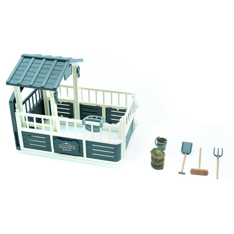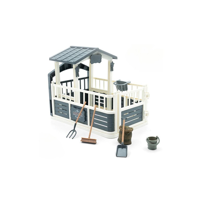 Acest set include o boxă pentru cai împrejmuită în gri și alb, cu ușă de grajd, un sac de hrană pentru cai, o găleată și ustensile de curățat, inclusiv o lopată, o mătură și o furcă.