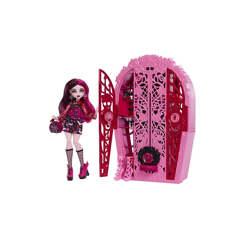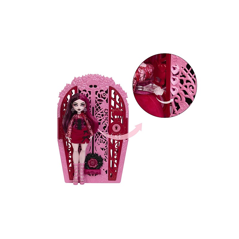 Introduceți talismanul la baza dulapului, apoi glisați-l în sus ca un fermoar pentru a dezvălui păpușa Draculaura în toată gloria ei fangtastică! Repetă dezvăluirea din nou și din nou pentru o distracție non-stop.