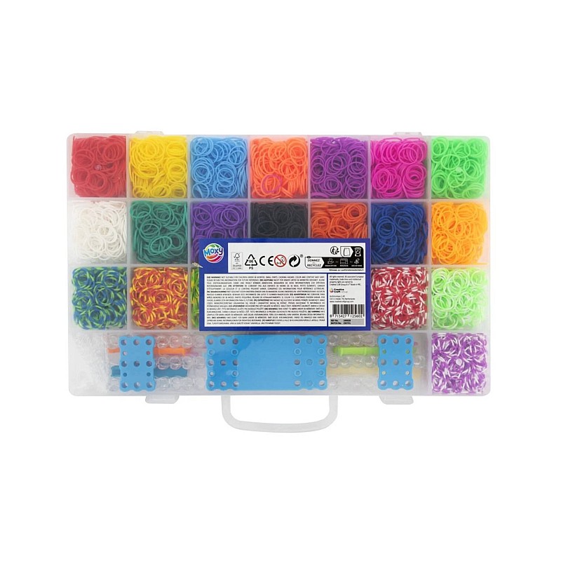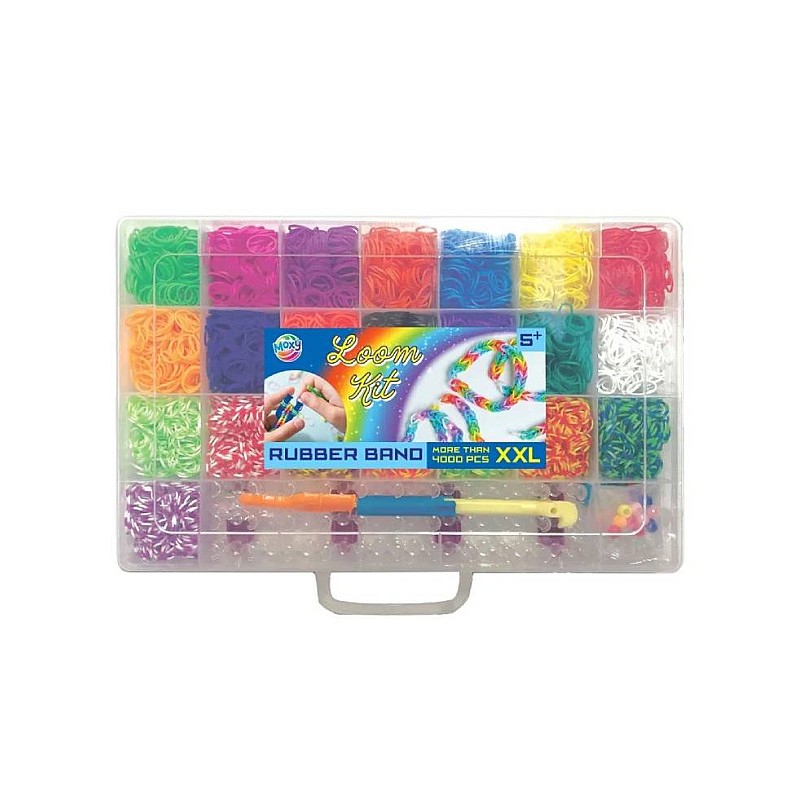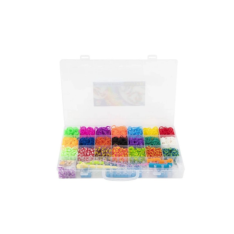 Cutia de depozitare din plastic include 22 de culori de benzi elastice și o pungă de mărgele, in total acestea depasind 4000 de bucati.