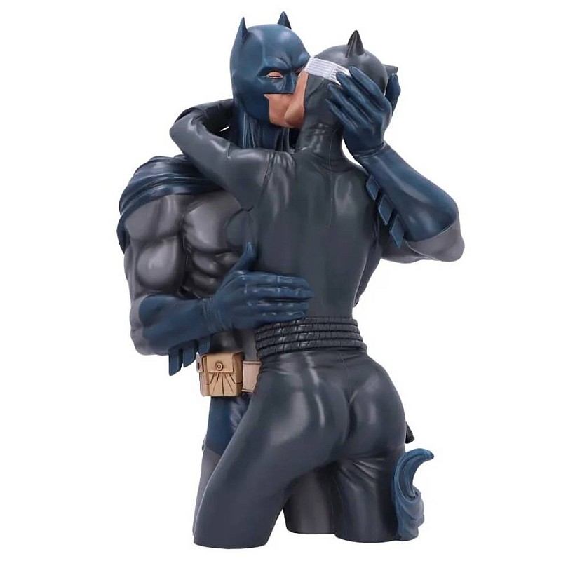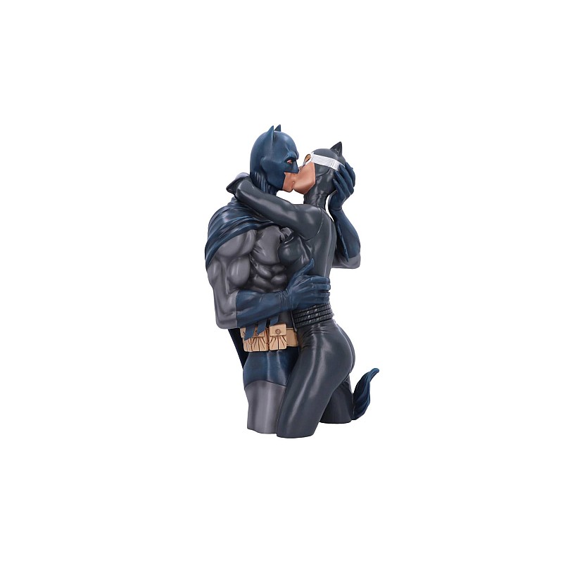 Având o înălțime impresionantă, acest bust dinamic îi prezintă pe Batman și Catwoman blocați într-o îmbrățișare pasională, capturând un moment de emoție intensă și chimie de netăgăduit între cele două personaje.