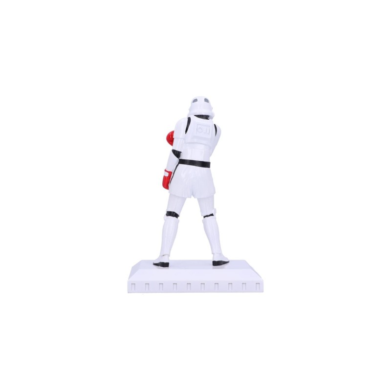 Aici putem vedea un Stormtrooper pregătit să intre în ring, purtând pantaloni scurți de box și mănuși roșii de box, el stă în picioare, gata de luptă.