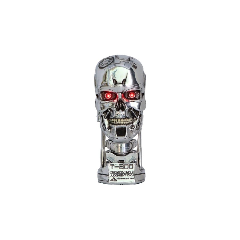 Realizat cu detalii incredibile, acest obiect de colecție prezintă craniul metalic iconic al T-800, completat cu ochi roșii LED amenințători și un craniu interior strălucitor care surprinde intensitatea implacabilă a legendarului asasin cyborg. Baterii incluse.