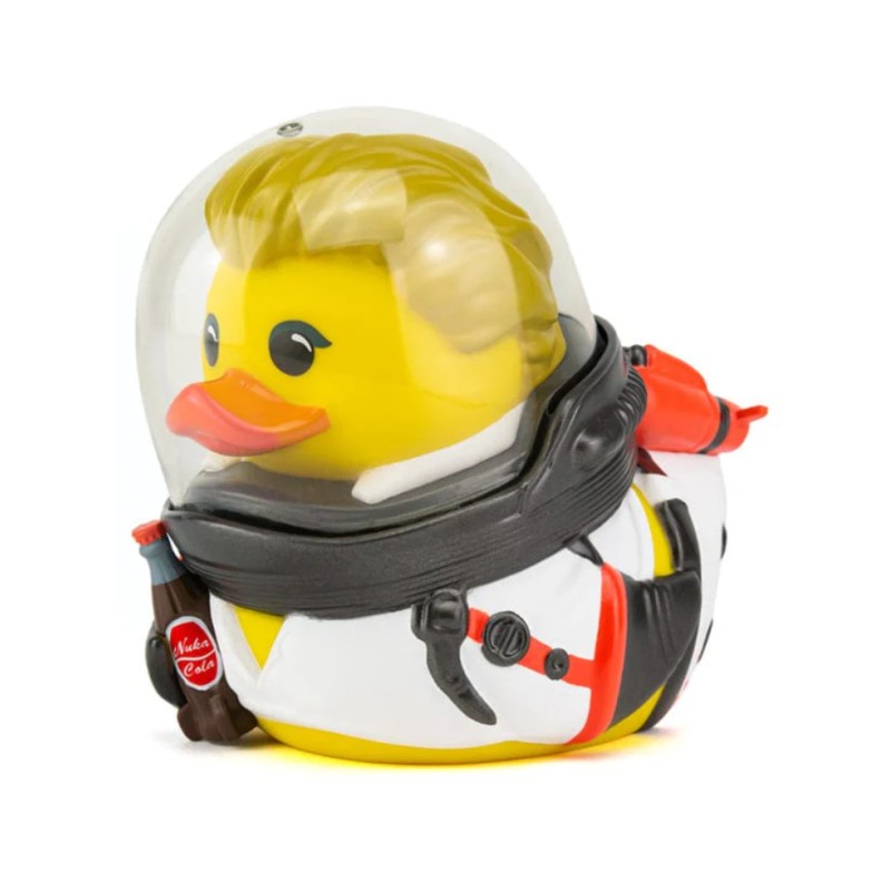 Fata Nuka Cola, care a terminat cu onorarea pustietății, își îndreaptă privirile spre iazul cu rațe. Nu o poți confunda în costum de rachetă și cască.