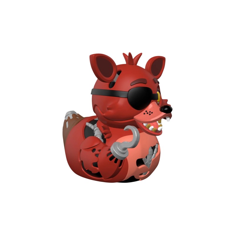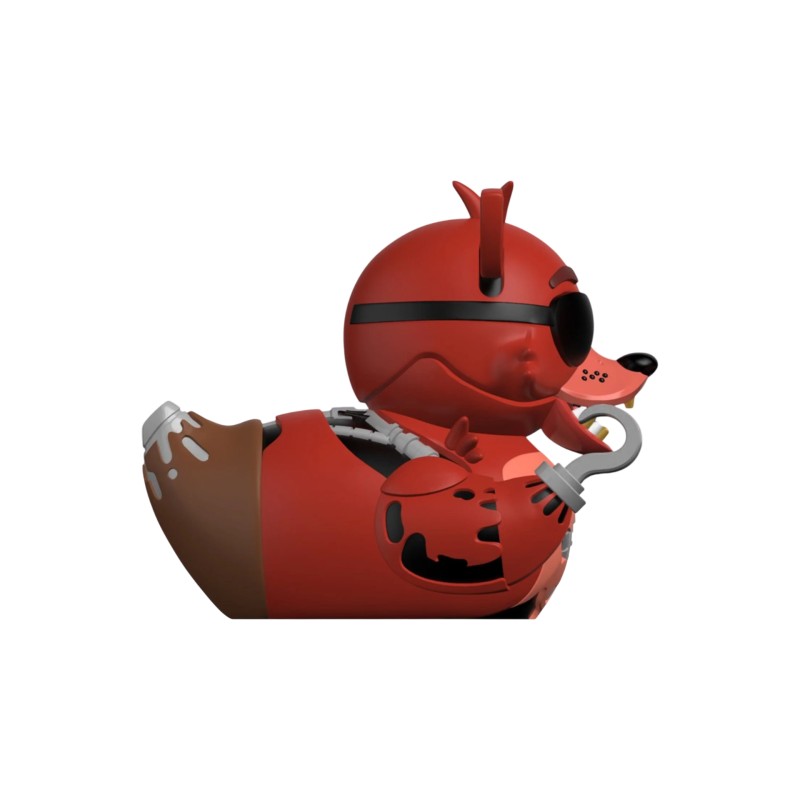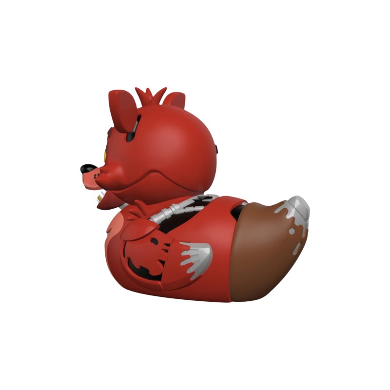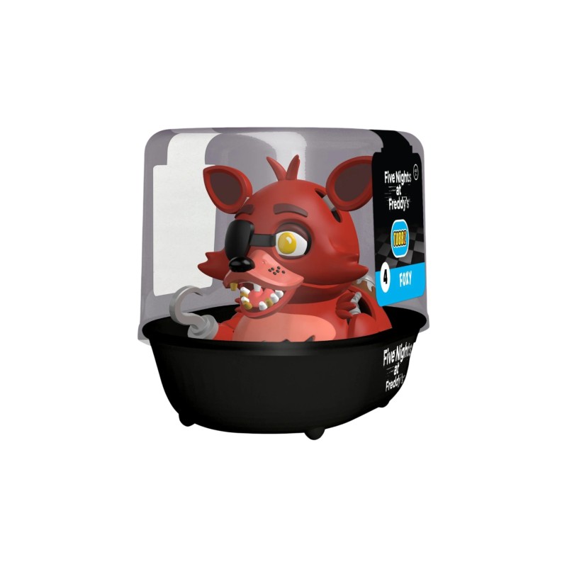 Vine într-o cadă de colecție, cu logo-ul Five Nights at Freddy's, „First Edition” imprimat pe baza raței și autocolant pe ambalaj.
