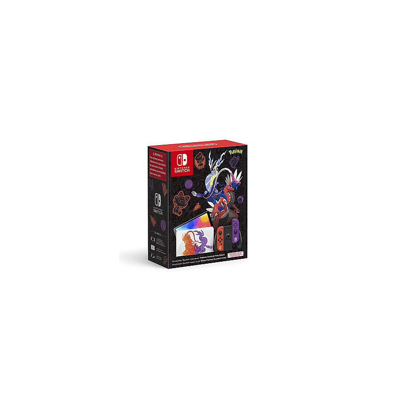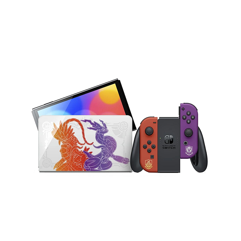 Modelul Nintendo Switch - OLED: Pokémon Scarlet & Violet Edition prezintă ilustrații speciale ale Pokémonilor legendari care apar în jocurile Pokémon Scarlet și Pokémon Violet, Koraidon și Miraidon, precum și ale Pokémonilor parteneri Sprigatito, Fuecoco și Quaxly.