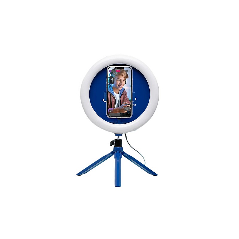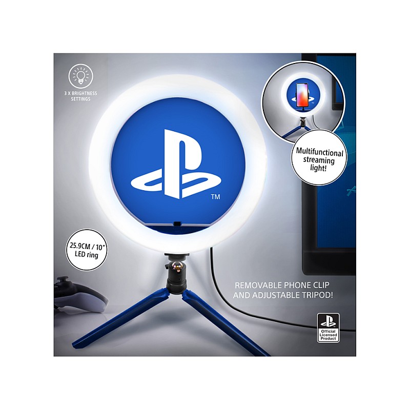 Realizată cu gândul la gameri, lumina inelară LED este prevăzută cu un trepied și un suport pentru telefon decorate în albastru PlayStation.