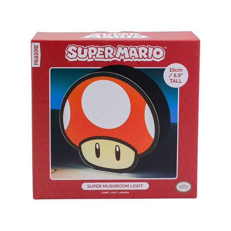 Are forma siluetei distinctive a lui Super Mushroom. Capacul roșu și alb caracteristic al ciupercii și fața simpatică a acesteia sunt imprimate pe partea din față a luminii cu caracter de cutie.