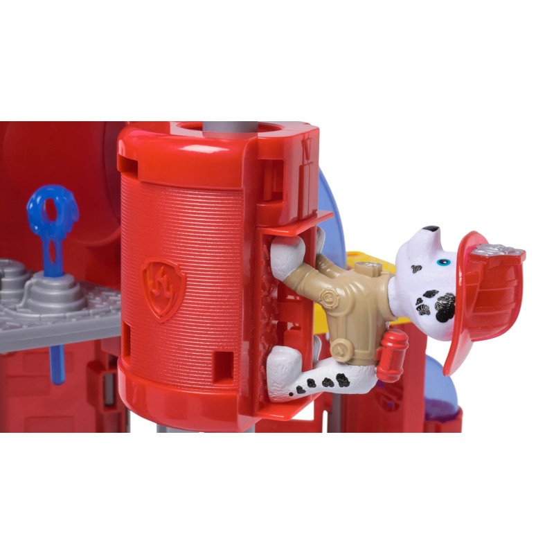 Când este timpul pentru acțiune, așezați-l pe Marshall pe stâlpul de pompieri și urmăriți-l cum se învârte în jos, apoi umpleți camionul la stația de alimentare cu apă imaginară înainte de a-l lansa în camionul său, cu lansatorul de vehicule, sau utilizați scara detașabilă pentru misiuni de joacă imaginare.