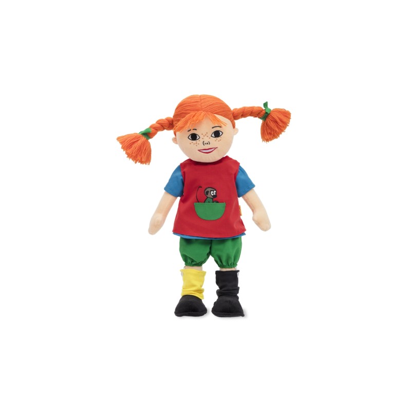 Această păpușă de 40 cm este o replică fidelă a faimoasei fetițe cu părul roșu, împletit în două cozi, care poartă o rochie colorată, șosete în dungi și pantofi verzi, completând astfel look-ul său inconfundabil.