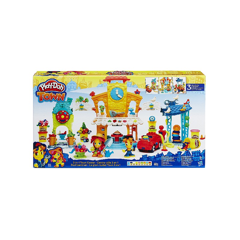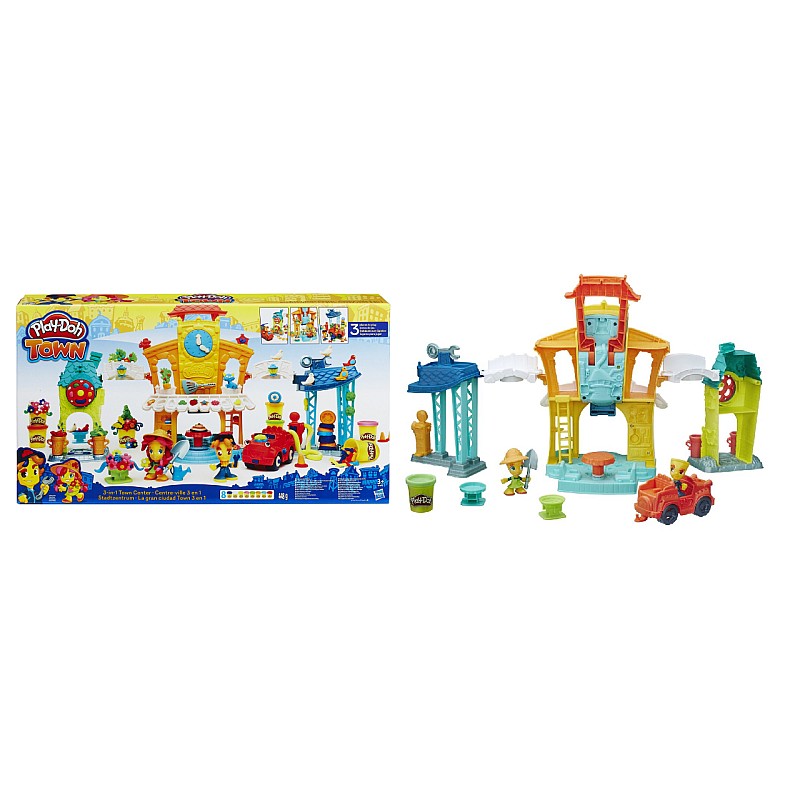În cutie se află 3 clădiri, 2 personaje, accesorii creative, 8 borcane de lut de modelare Play-Doh moale și o frumoasă decapotabilă.