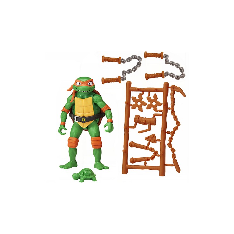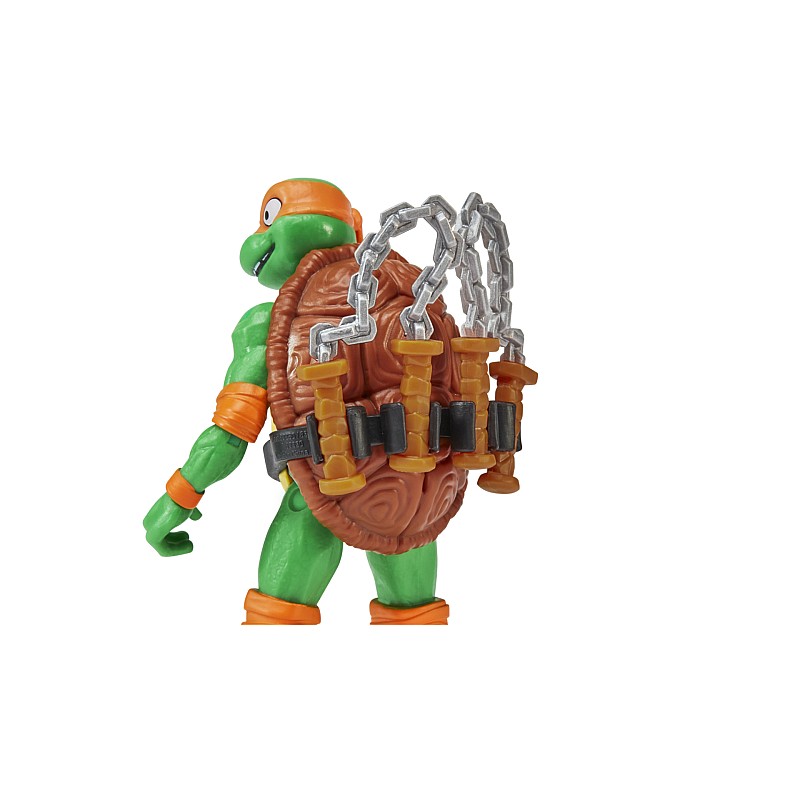 Mikey vine într-un ambalaj tip blister decorat intens, cu detalii strălucitoare și îndrăznețe, care includ branding-ul filmului TMNT Mutant Mayhem.