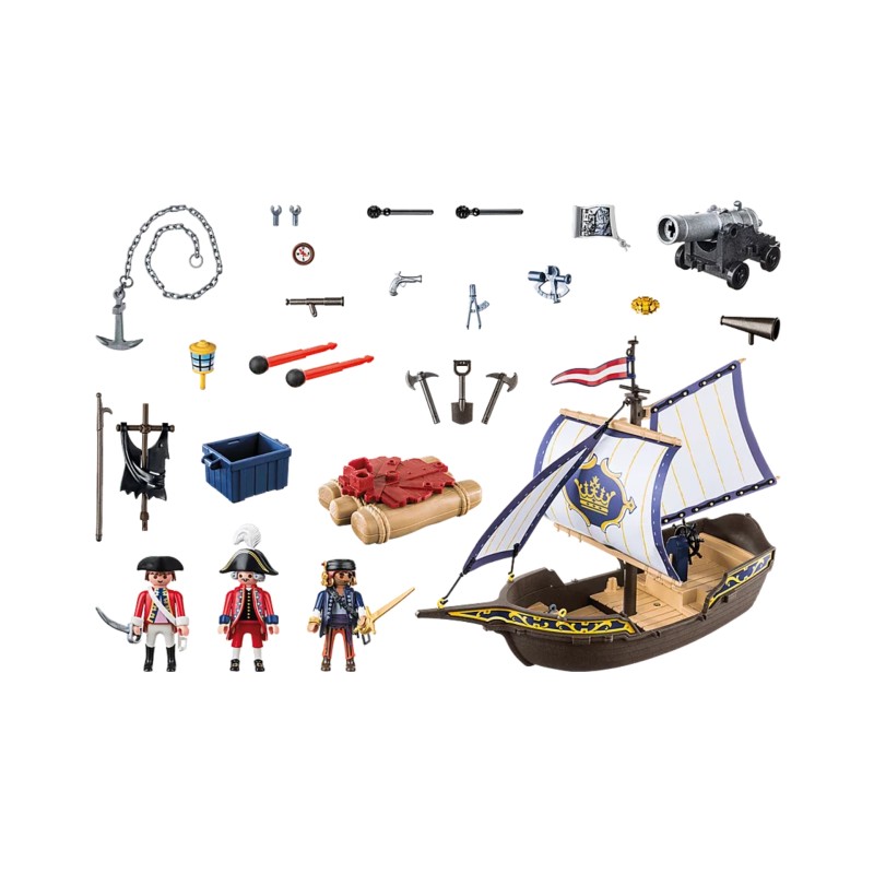 Setul de joacă include o barcă cu pânze și o plută cu pistol cu bolțuri, trei figurine PLAYMOBIL, o cutie, o hartă a comorii, și multe alte accesorii. Clemele pentru picioare de pe puntea bărcii și de pe plută asigură o mai bună stabilitate a figurinelor.
