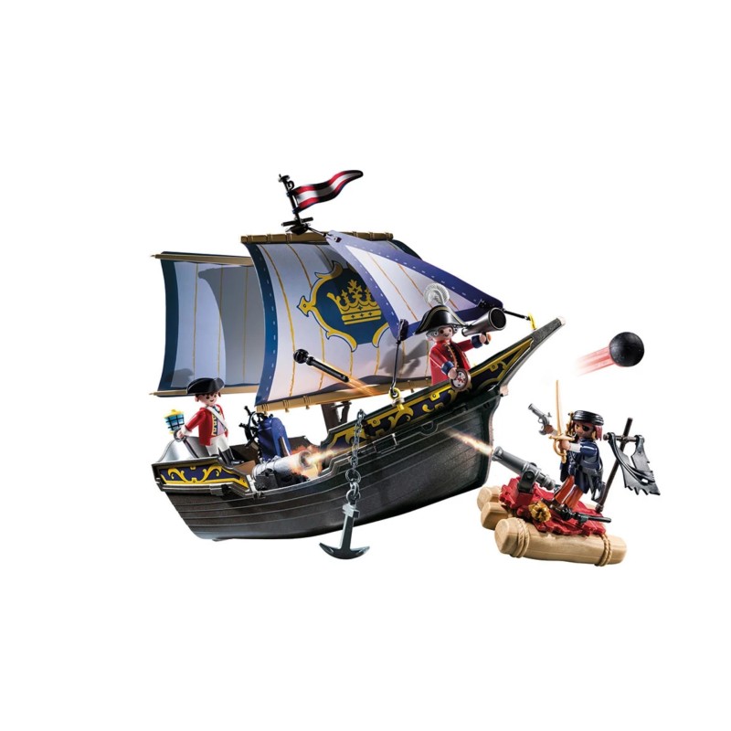 Caravela Playmobil Pirates Redcoat este dotată cu un tun de tragere și o ancoră pentru a face legea asupra unui pirat de pe plută - nu-l poți lăsa să scape cu comoara! Barca plutitoare include 3 figurine și o plută de mare.