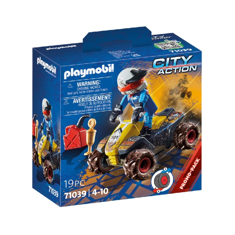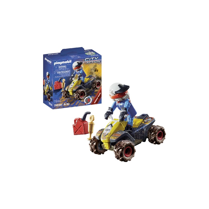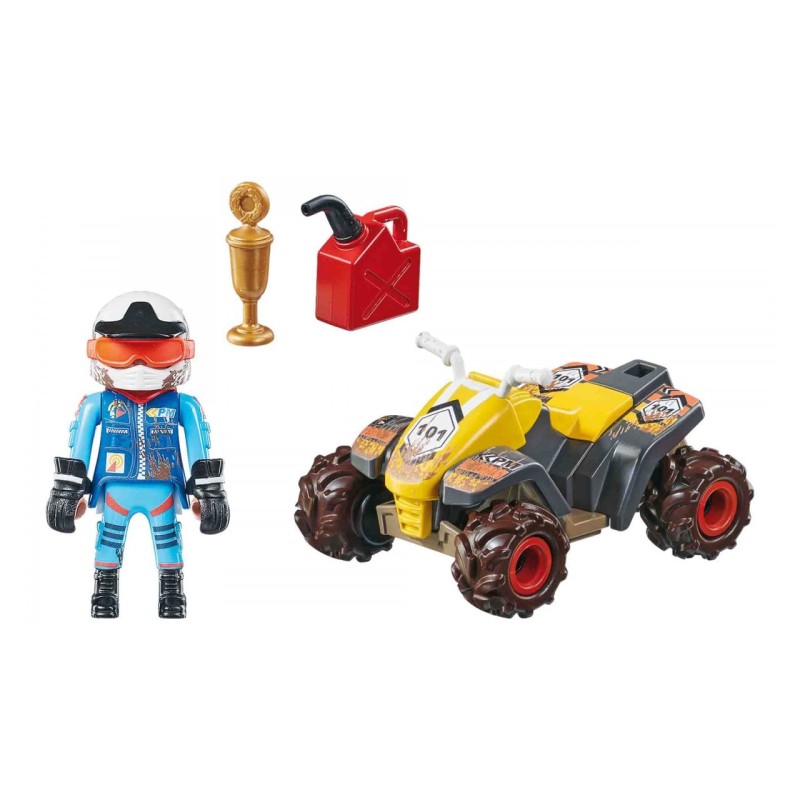 Setul include: 1 figurina, un quad cu motor de tragere inapoi, trofeu, casca si bidon de benzina.