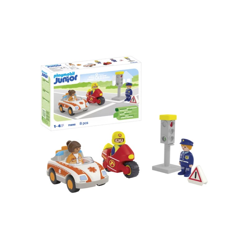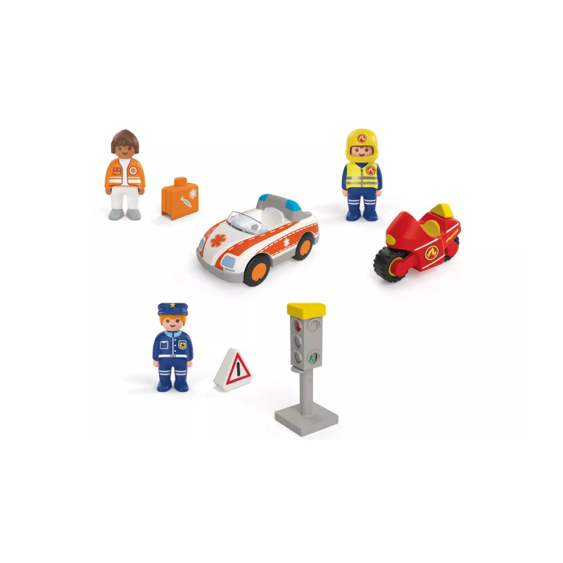 Setul include un ofițer de poliție, pompier, paramedic, motocicletă, ambulanță, semafor și alte accesorii.