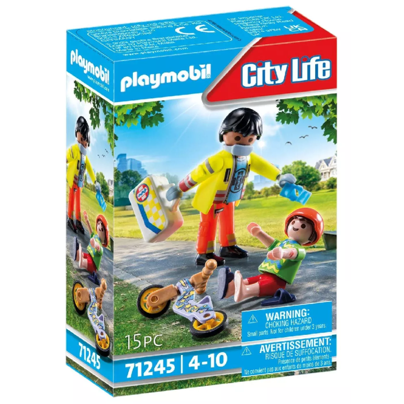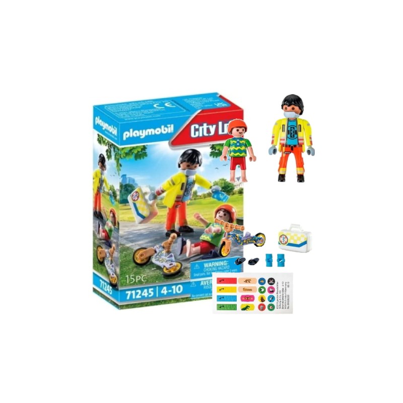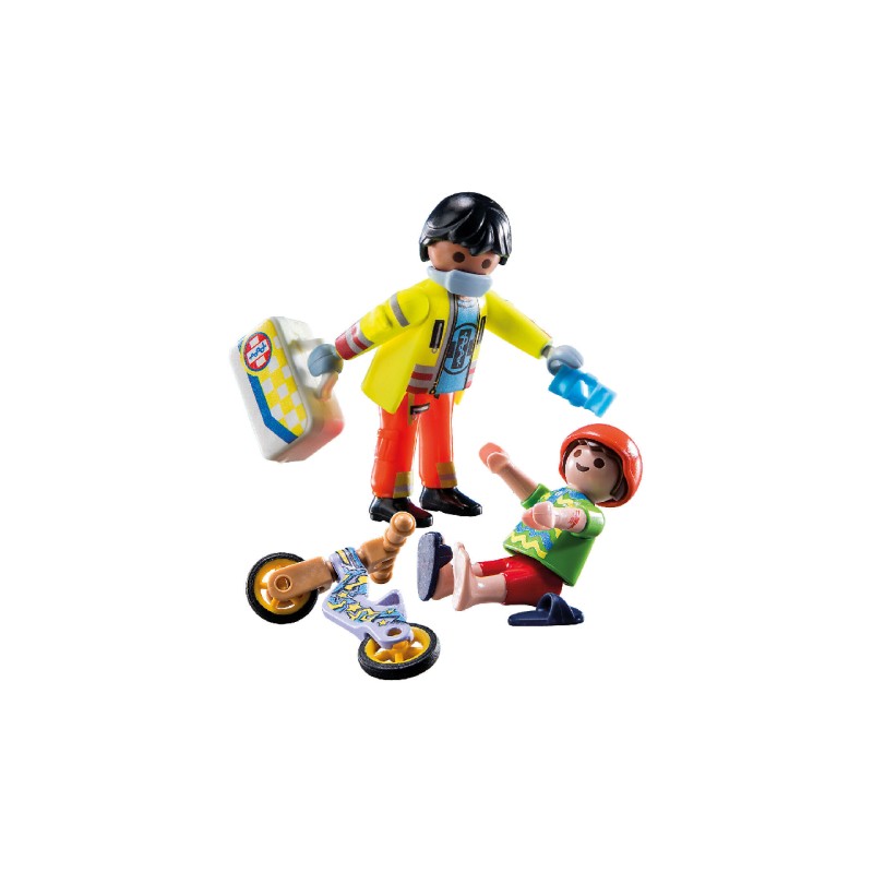 Un suvenir sau un cadou minunat pentru micii paramedici. Setul de jucării pentru copii include două figurine PLAYMOBIL, un scuter, o trusă de prim ajutor, atele de bandaj, cască și alte accesorii.