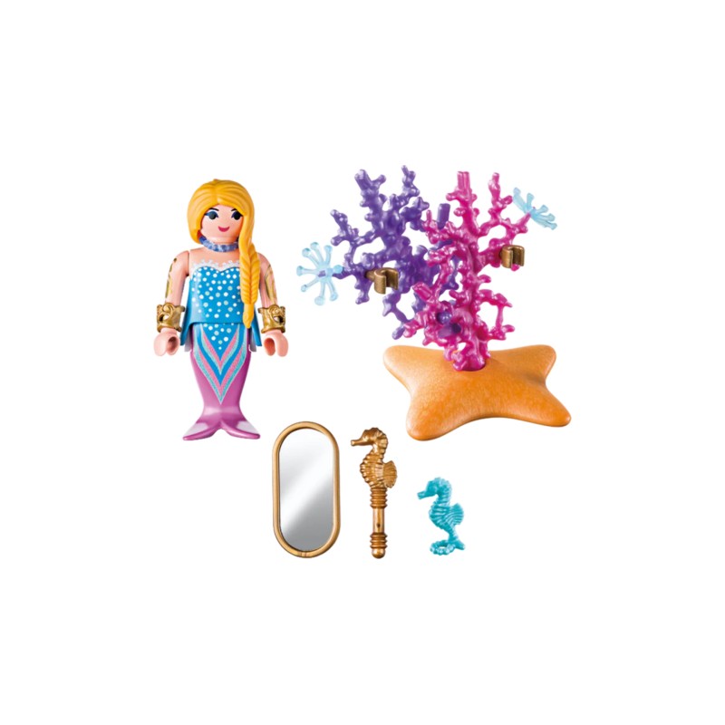 Include sirenă, corali, oglindă, sceptru de căluț de mare și alte accesorii.