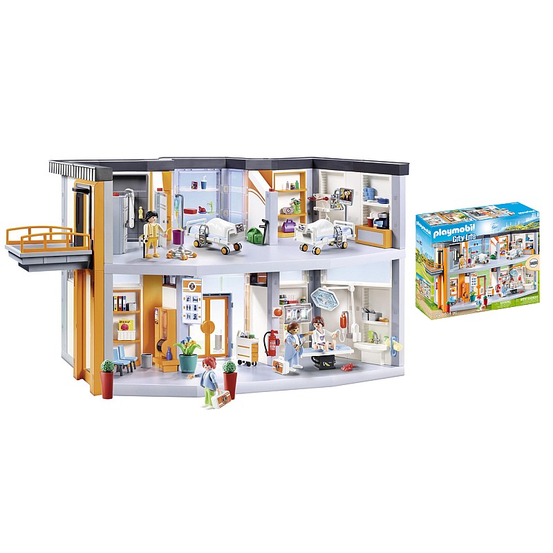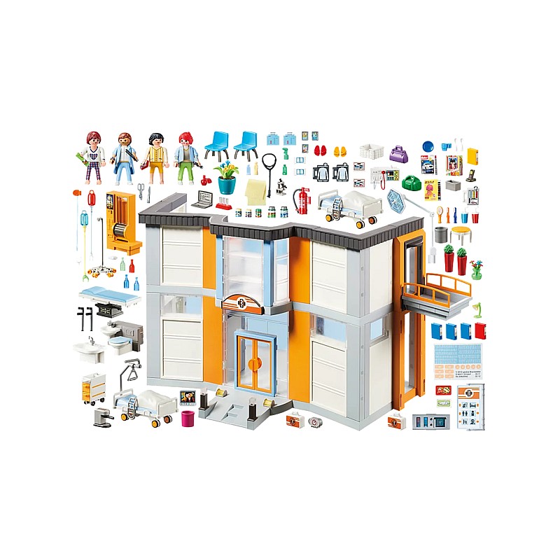 Setul include patru figurine, clădirea spitalului, dispozitive medicale, paturi rulante pentru pacienți, mobilier pentru camera pacienților, fișe medicale, cărucior medical, stâlp pentru perfuzii și multe alte accesorii.