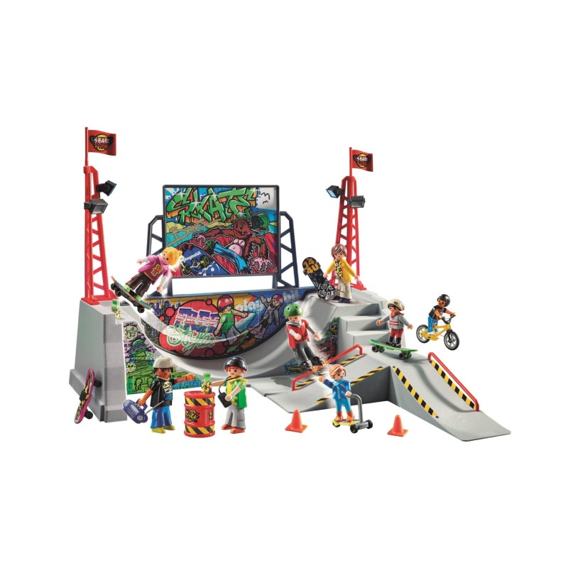Setul de joaca contine cinci figurine PLAYMOBIL, trei figurine pentru copii, un half pipe, o rampa, patru skateboard-uri, doua scutere, o bicicleta si multe alte accesorii interesante.