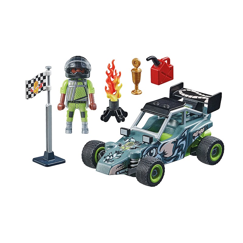 Pachetul PLAYMOBIL include o figurină PLAYMOBIL cu cască, o mașină de cascadorii, steaguri ale câștigătorului, bidon de benzină, trofeu și alte accesorii pentru jocuri de rol captivante.