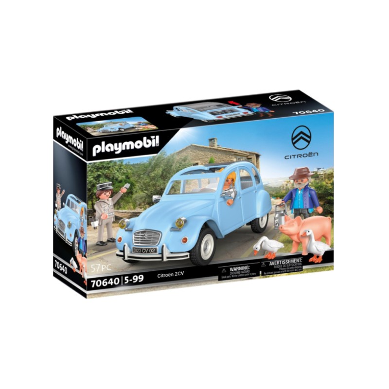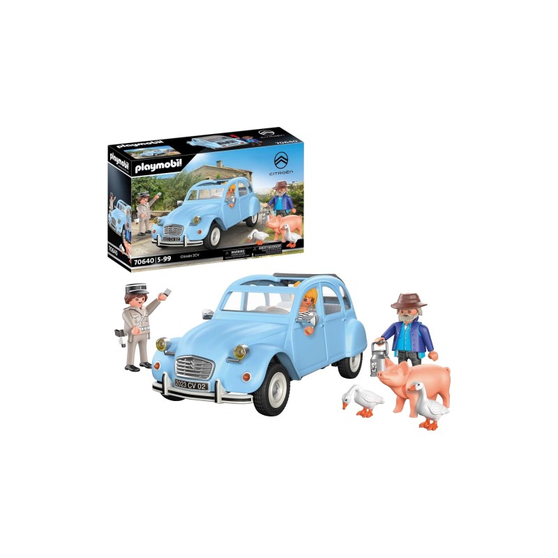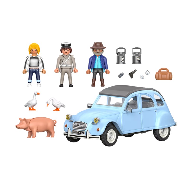 Setul de jucării include un Citroën 2CV de la PLAYMOBIL, trei figurine PLAYMOBIL, un porc, două gâște, două cutii de lapte, faruri frontale și multe alte figurine drăguțe.