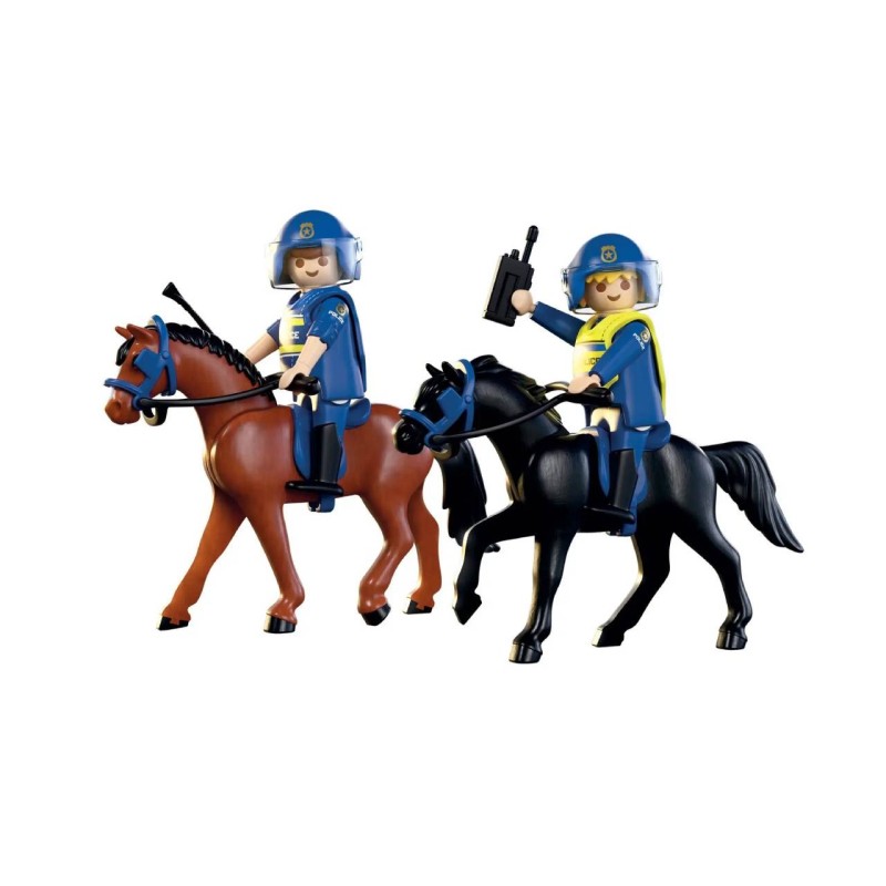 Click-clock prin oraș cu Escadrila de Poliție Playmobil! Călare pe caii lor de încredere, polițista și polițistul patrulează străzile, pregătiți de acțiune cu radio, lanternă și veste detașabile.