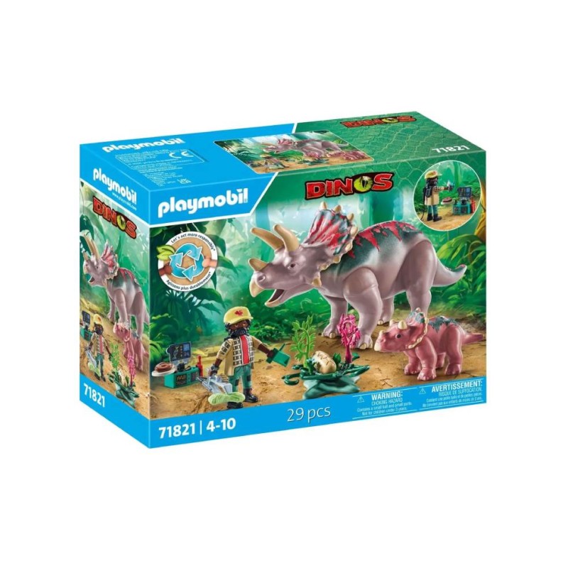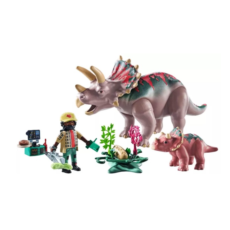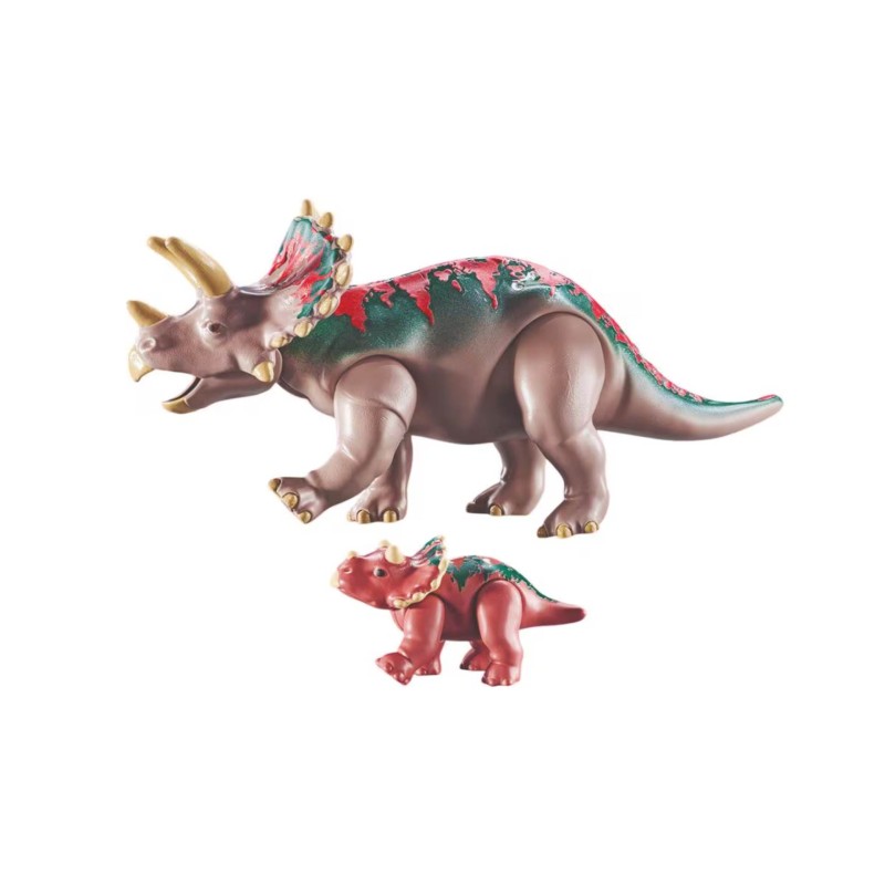 Bucurați-vă de povestiri creative cu piese mobile, plante detașabile și accesorii distractive care stârnesc curiozitatea și inspiră aventuri pline de imaginație cu Familia Triceratops PLAYMOBIL.