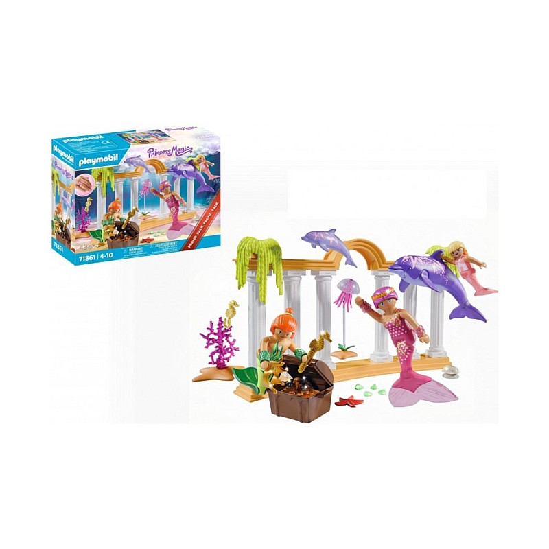 Setul include două sirene adulte, o sirenă copil, delfin adult, delfin copil, coloană, alge marine, cufăr cu comori și alte accesorii.