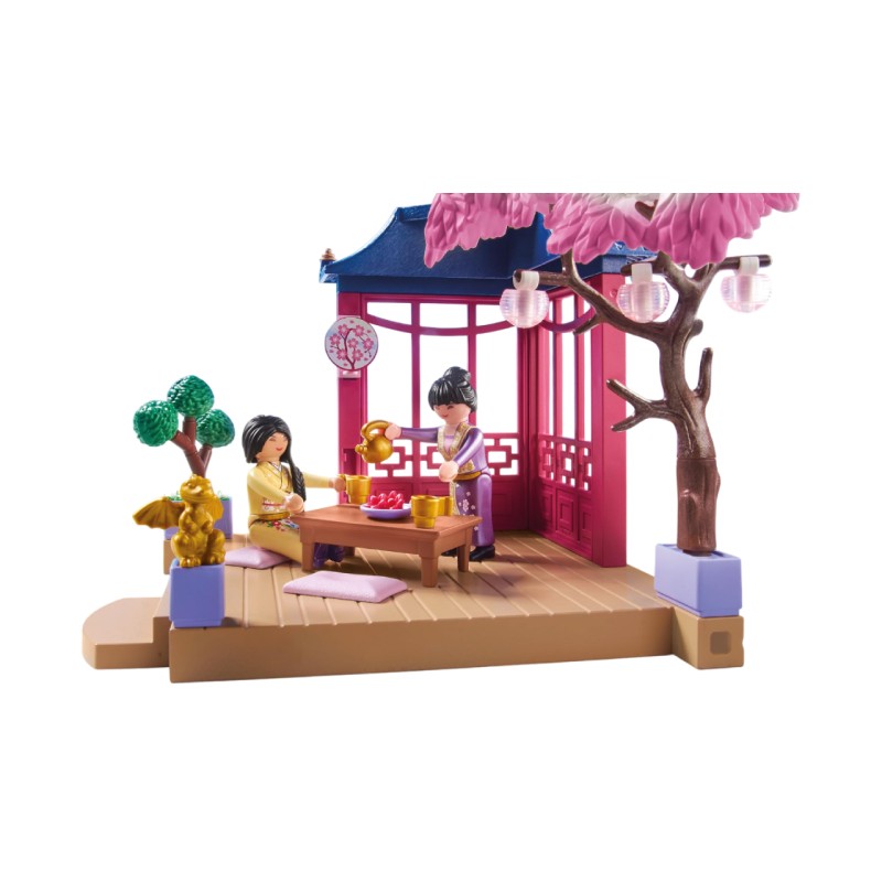 Pavilionul elegant, decorat cu figuri de dragoni ornate și felinare strălucitoare, este înconjurat de un iaz koi, flori de cireș magnifice și plante de bambus luxuriante.