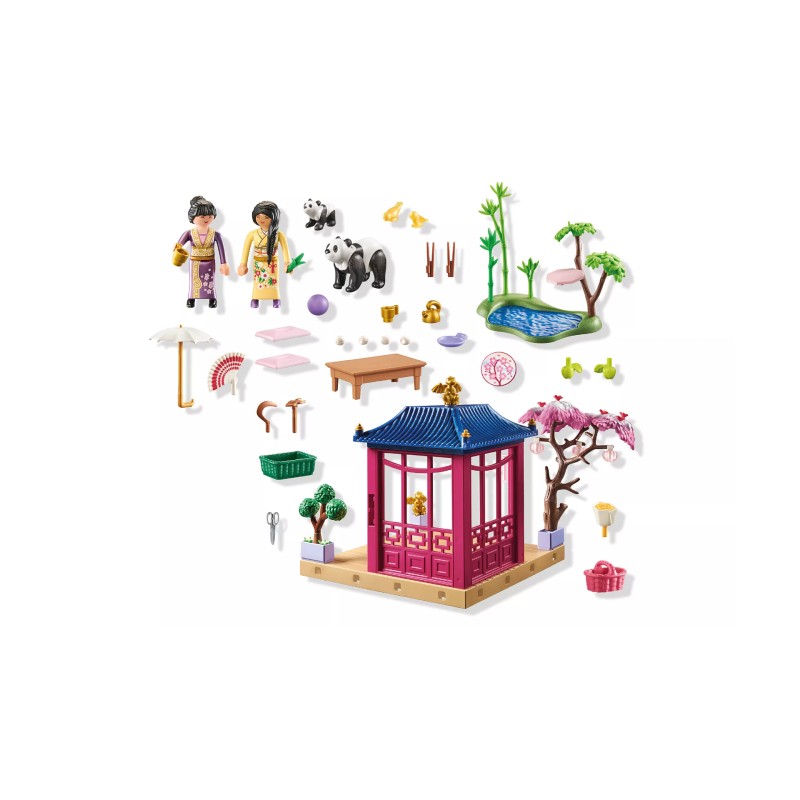 Bine ați venit în grădina asiatică! Descoperiți pavilionul frumos unde are loc o ceremonie a ceaiului.