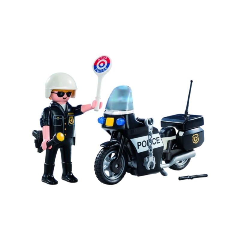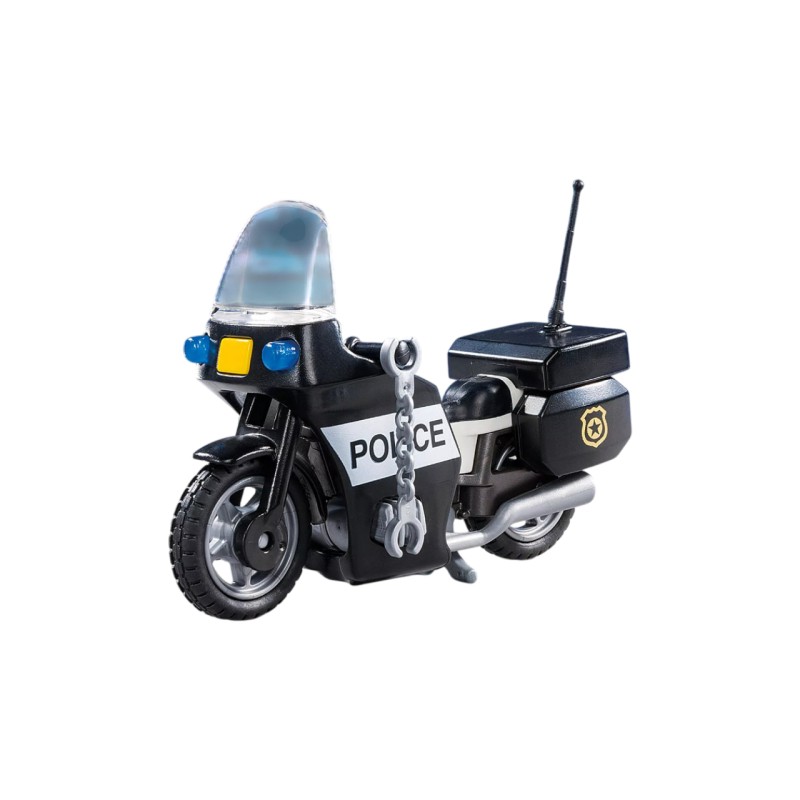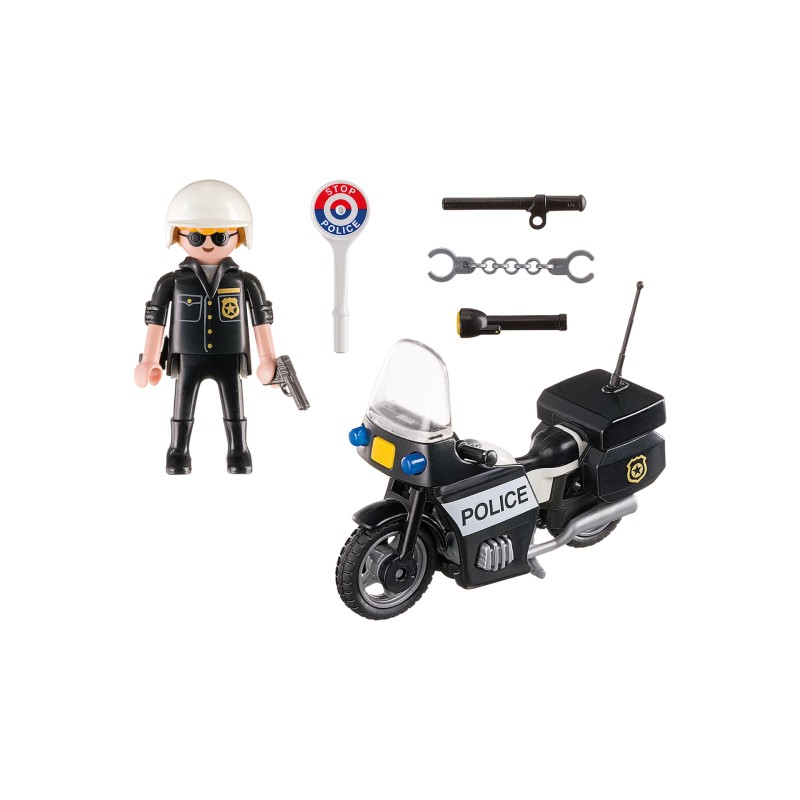 Setul include o figurină de polițist, motocicletă, cască, semnul poliției, lanternă și accesorii suplimentare.
