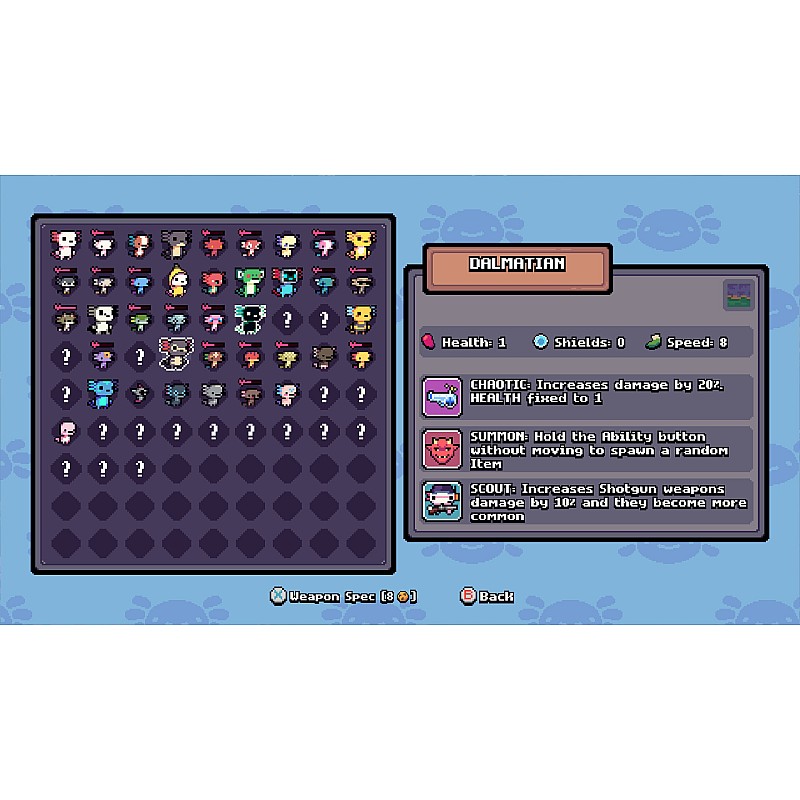 Deși arată adorabil, Axolotls au arme puternice și vor doborî orice se interpune între ei și următoarea lor masă. Luptă-ți drumul prin diferite biome și cucerește camere generate aleatoriu, cu un șef înfricoșător la sfârșitul fiecărui biom.