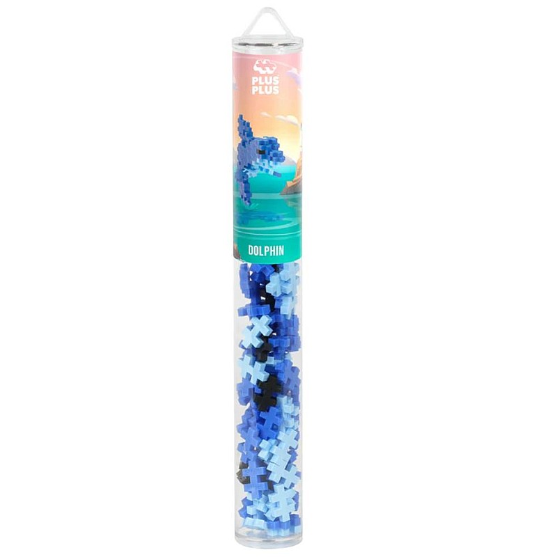 Dolphin Tube conține 100 de piese Plus-Plus într-un tub reutilizabil și ușor de transportat.