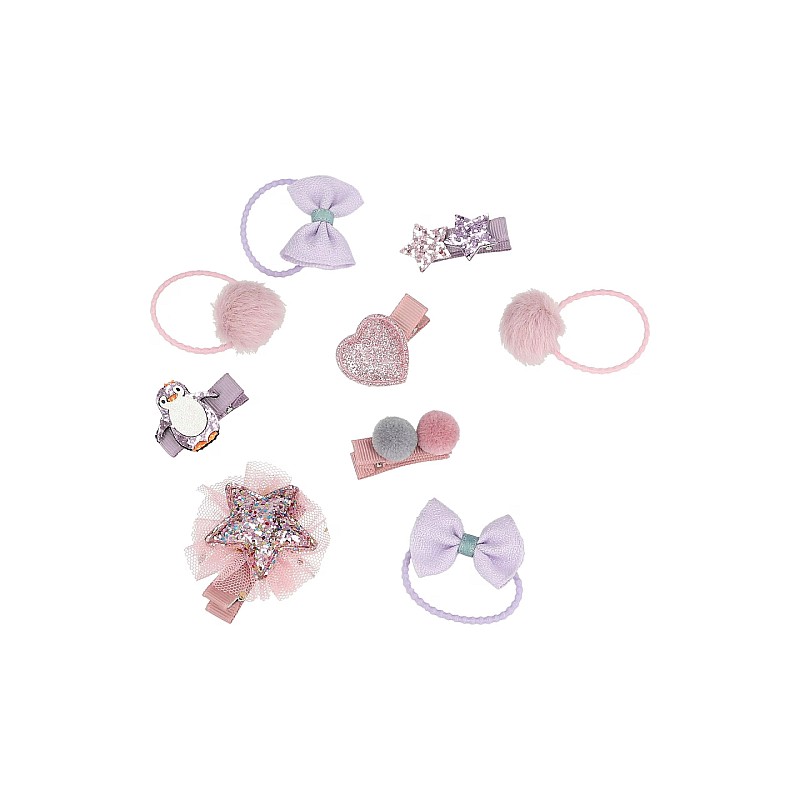 Acesta include: două agrafe de păr cu un pompon pufos, două agrafe de păr cu o fundă, patru agrafe de păr mici cu stele, o inimă, un pinguin și un duo de pompoane, precum și o agrafă de păr mai mare cu o stea și tul.