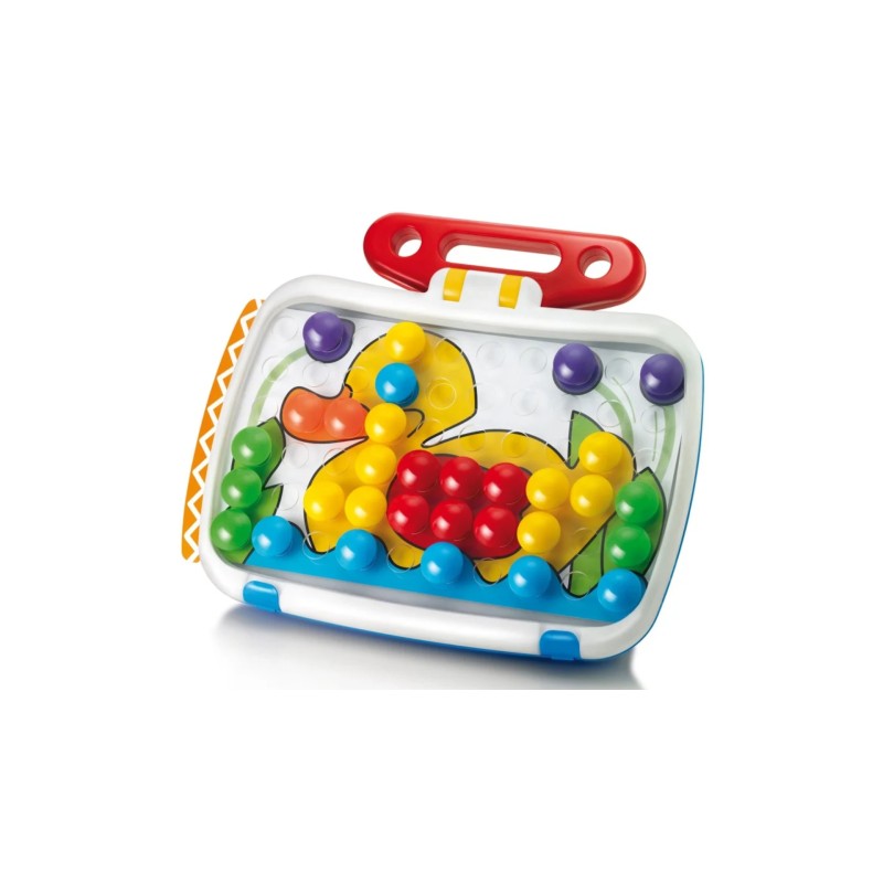 Setul conține o tablă specială perforată, pionii mari și ușor de manevrat, precum și carduri cu modele pretipărite, care ghidează copiii în realizarea primelor lor mozaicuri.