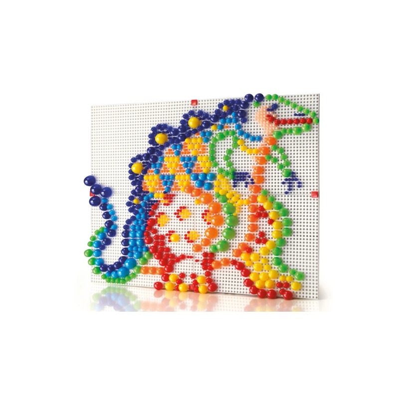 Setul include 600 de pioni colorați și 4 plăci modulare, care pot fi utilizate separat sau conectate între ele pentru a forma un panou mai mare, permițând copiilor să creeze modele mai complexe.