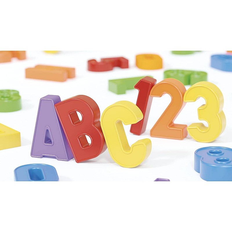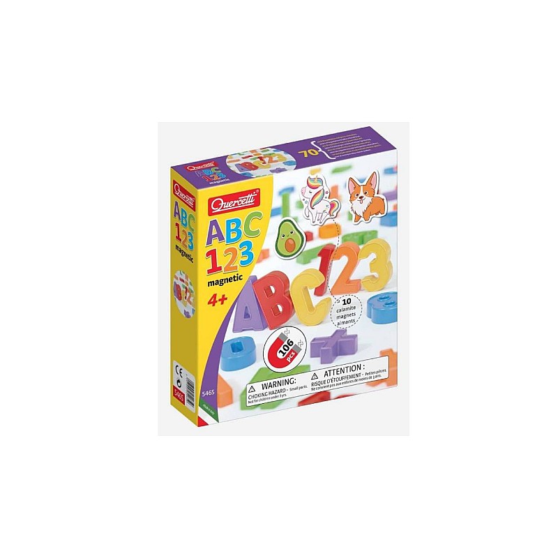 Setul Quercetti ABC 123 Magnetic include, pe lângă cele 106 piese magnetice (48 litere, 48 cifre & simboluri și 10 pictograme decorative), și seturi de stickere separate atașate pentru aplicații creative.