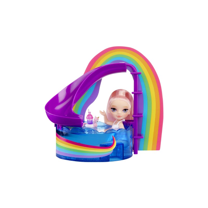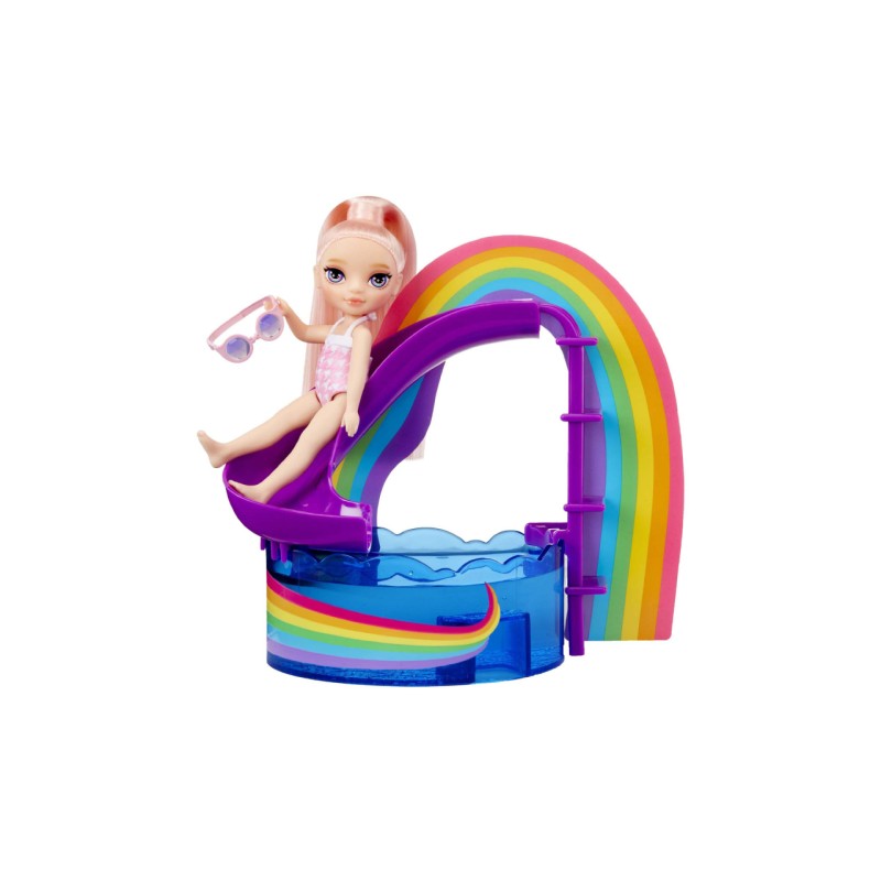 Setul vine cu un piscină decorată cu o tobogan în formă de curcubeu, care aduce acțiune și aventură în jocurile imaginate de copii.