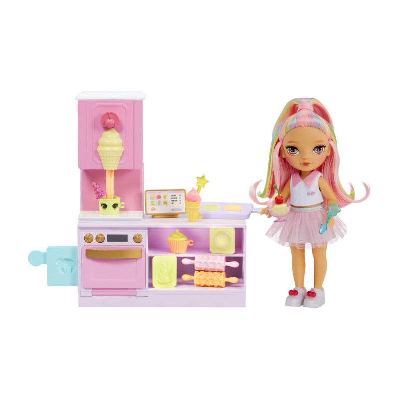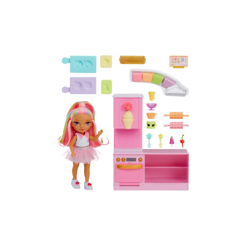 Setul conține o mini-bucătărie cu accesorii de desert și un kit de „aluat” colorat care nu se usucă, pentru a crea înghețată, cupcakes și alte delicii pentru păpușă.
