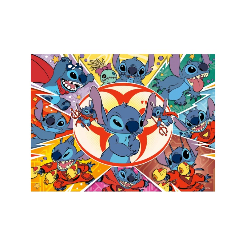 Acest puzzle de 100 de piese plin de acțiune îl prezintă pe obraznicul Stitch făcând năzbâtii.
