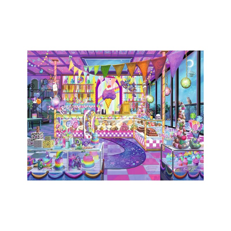 Acest puzzle colorat "Stardust Scoops" prezintă totul, de la prăjituri curcubeu la turnuri de gogoși și munți uriași de înghețată delicioasă.