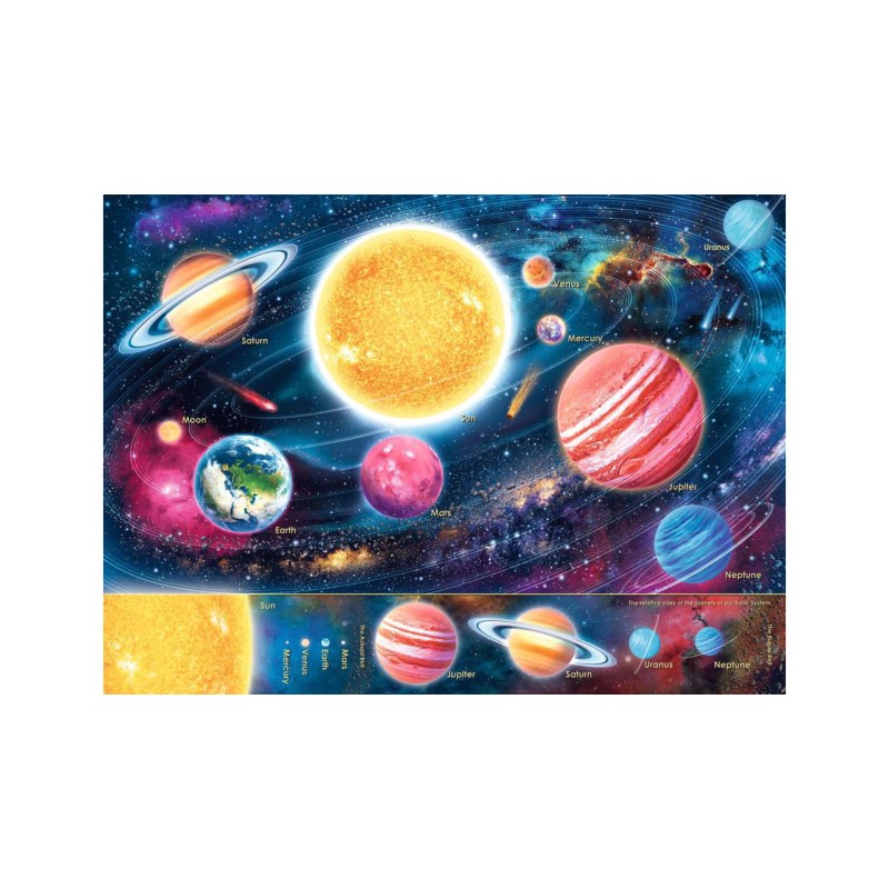 Puzzle-ul finalizat prezintă o frumoasă ilustrație originală a Sistemului Solar, care este o explozie de culori din punct de vedere vizual, dar și educativă.