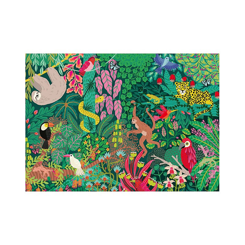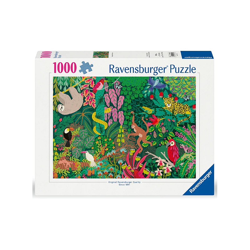 Pășește într-o lume luxuriantă de verdeață vibrantă și faună exotică cu puzzle-ul Ravensburger Magical Rainforest de 1000 de piese.
