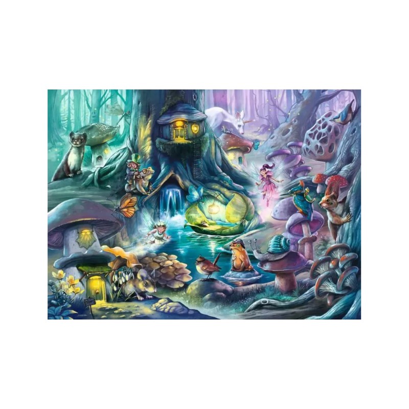 Această scenă magică este plină de detalii fermecătoare, inclusiv zâne jucăușe, case ciudate cu ciuperci cuibărite în tufișuri și o cascadă strălucitoare care curge prin pădure.